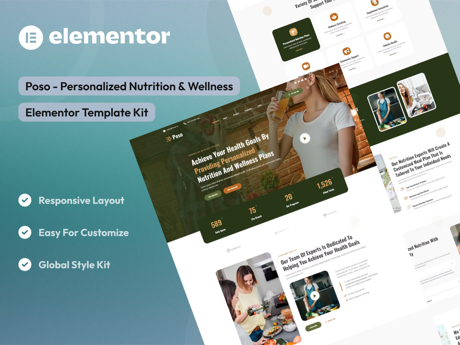 No coding skills required! Poso – Personalized Nutrition & Wellness Elementor Template Kit is built with Elementor, making customization a breeze. Effortlessly modify the layout, colors, and content to suit your brand identity.